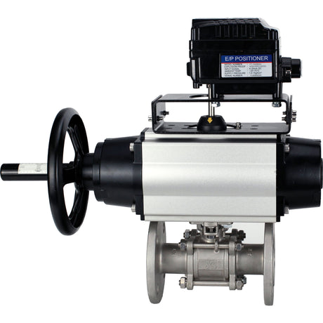 Ball valves Elephant BV3232P(3pc)-FP-F-ISO-H DN65-100 25/40 bar flanged, 316 stainless steel, full bore, seal - PTFE, with pneumatic drive PA-DA and MON3-700-T38-ISO manual backup, YT-1000RSN electro-pneumatic positioner without feedback