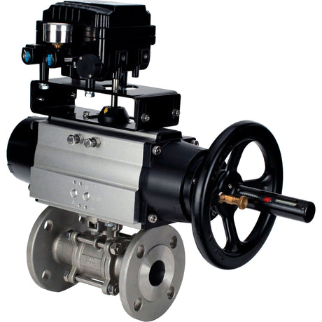 Ball valves Elephant BV3232P(3pc)-FP-F-ISO-H DN65-100 25/40 bar flanged, 316 stainless steel, full bore, seal - PTFE, with pneumatic drive PA-DA and MON3-700-T38-ISO manual backup, YT-1000RSN electro-pneumatic positioner with feedback