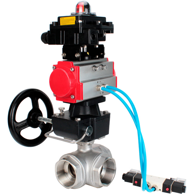 Kugelhähne Elephant BV3232P(4pc)-SP-3WL-T-ISO-H, Gehäusematerial - Edelstahl AISI 316, Dichtung - PTFE / PTFE / Teflon, mit pneumatischem Doppelwirkungsantrieb PA-DA, 4V320-08 220V, LSU APL-410N Ex, Handrad MON