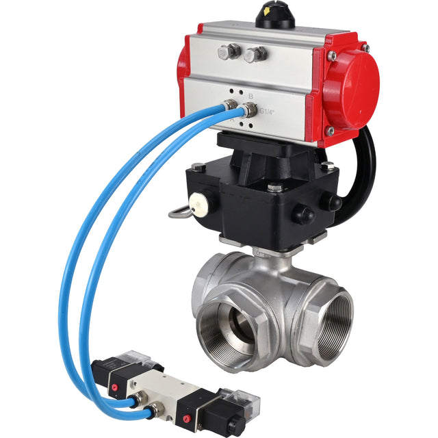 Kugelhähne Elephant BV3232P(4pc)-SP-3WL-T-ISO-H, Gehäusematerial - Edelstahl AISI 316, Dichtung - PTFE / PTFE / Teflon, mit pneumatischem Doppelwirkungsantrieb PA-DA, 4V320-10 220V, Handrad MON