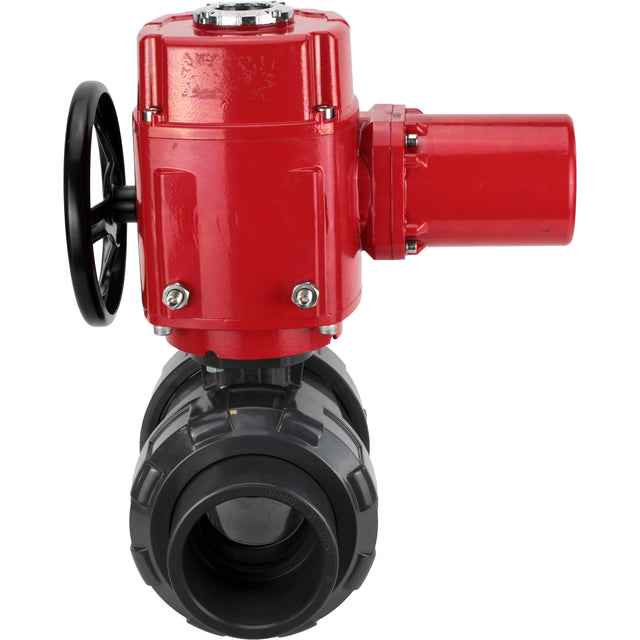 Ball valves Elephant BV4242E-FP-GRM-ISO, body material - UPVC, ball material - UPVC, seal - EPDM, with explosion-proof quarter-turn actuator QT-EX-M-O2-380VAC-U1, torque clutch and handwheel