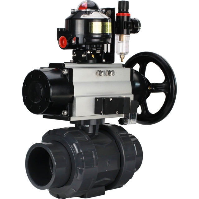 Ball valves Elephant BV4242E-FP-GRM-ISO, body material - UPVC, ball material - UPVC, seal - EPDM, with pneumatic actuator double action PA-DA-105-1, pneumatic distributor 4M310-08 24V, LSU APL-510N EX and ATU AFC2000