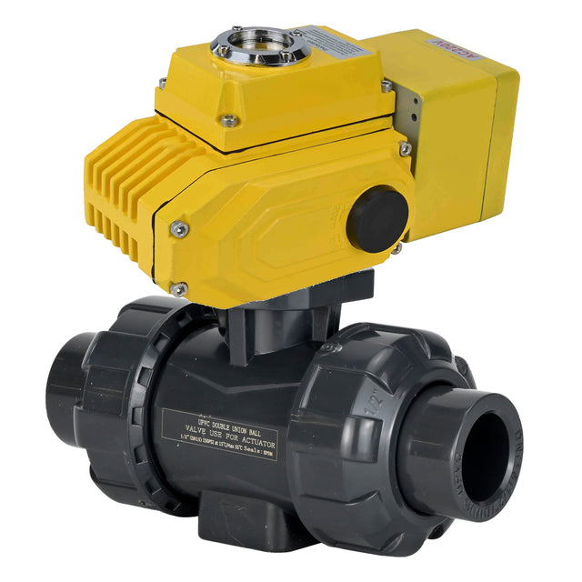 Ball valves Elephant BV4242E-FP-GRM-ISO, body material - UPVC, ball material - UPVC, seal - EPDM, with quarter-turn actuator QT-N-EM-B1-220VAC-U1, feedback sensor and 0-10V input control signal
