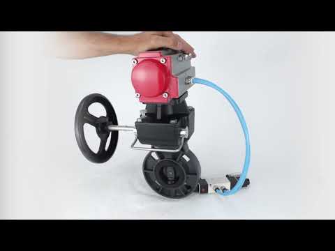 Butterfly valves Elephant WBV4242E-2W-Fb-ISO, body material - UPVC, disc material - UPVC, seal - EPDM, with pneumatic actuator double action PA-DA, pneumatic distributor 4V320-08 220V and handwheel MON - DN100 / 10 bar ist auf Lager und wird versandt, sobald es wieder verfügbar ist