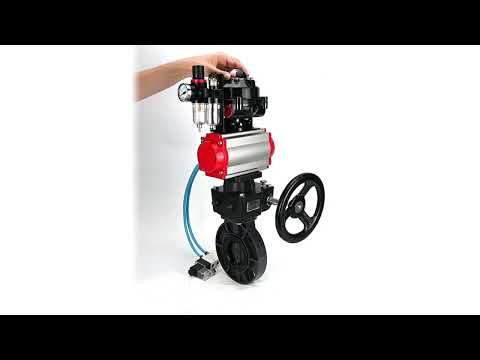 Butterfly valves Elephant WBV4242E-2W-Fb-ISO, body material - UPVC, disc material - UPVC, seal - EPDM, with pneumatic actuator double action PA-DA, pneumatic distributor 4V320-08 220V, LSU APL-510N EX, ATU AFC2000 and handwheel MON - DN100 / 10 bar ist auf Lager und wird versandt, sobald es wieder verfügbar ist