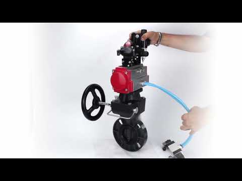 Butterfly valves Elephant WBV4242E-2W-Fb-ISO, body material - UPVC, disc material - UPVC, seal - EPDM, with pneumatic actuator double action PA-DA, pneumatic distributor 4V320-10 220V, LSU APL-210N, ATU AFC2000 and handwheel MON