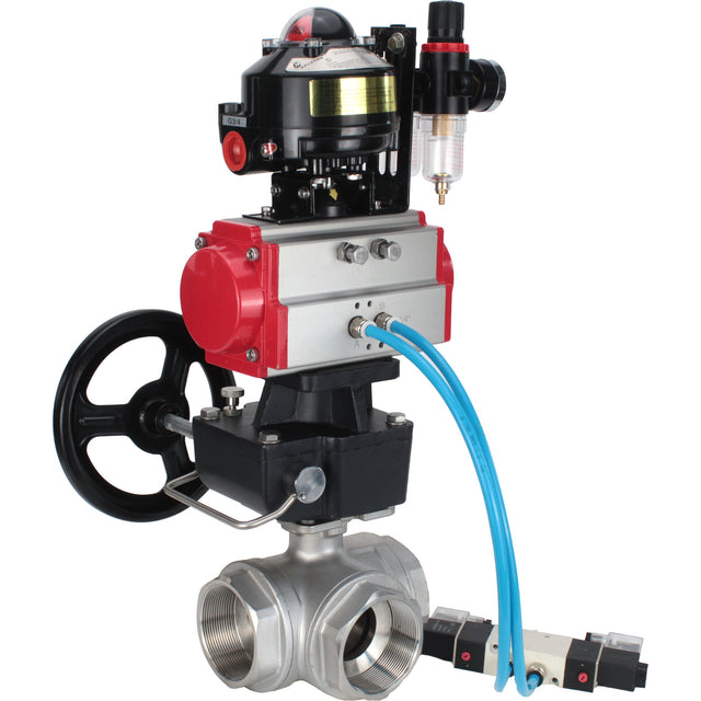 Kugelhähne Elephant BV3232P-SP-3L-T 3-Wege L-Typ, Gewinde, Gehäuse - Edelstahl SS316, Dichtung - PTFE, mit pneumatischem Antrieb PA-DA-052-083 pneumatischer Verteiler 4V320-08 Getriebe MON ATU AFC2000 LSU APL-510N-EX - DN100 / 63 bar ist auf Lager und wird versandt, sobald es wieder verfügbar ist