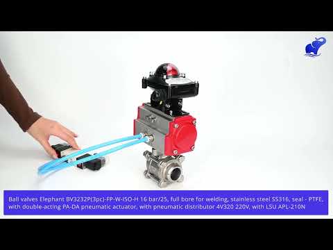 Kugelhähne Elephant BV3232P(3pc)-FP-W-ISO-H 16 bar/25, voller Durchgang zum Schweißen, Edelstahl SS316, Dichtung - PTFE, mit doppeltwirkendem PA-DA Pneumatik-Antrieb, mit Pneumatikverteiler 4V320-08 220V, mit LSU APL-210N - DN10 / 63 bar ist auf Lager und wird versandt, sobald es wieder verfügbar ist