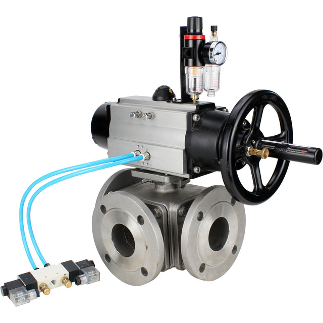 Ball valves Elephant BV3232P(4pc)-FP-3WL-F-ISO-H DN100 16 bar full bore, flanged, body - stainless steel SS316, ISO flange F10/F12, square 19x19, with double pneumatic actuator PA-DA-105-1 action, pneumatic distributor 4V320-10 220V and ATU AFC2000 - DN100 / 16 bar ist auf Lager und wird versandt, sobald es wieder verfügbar ist