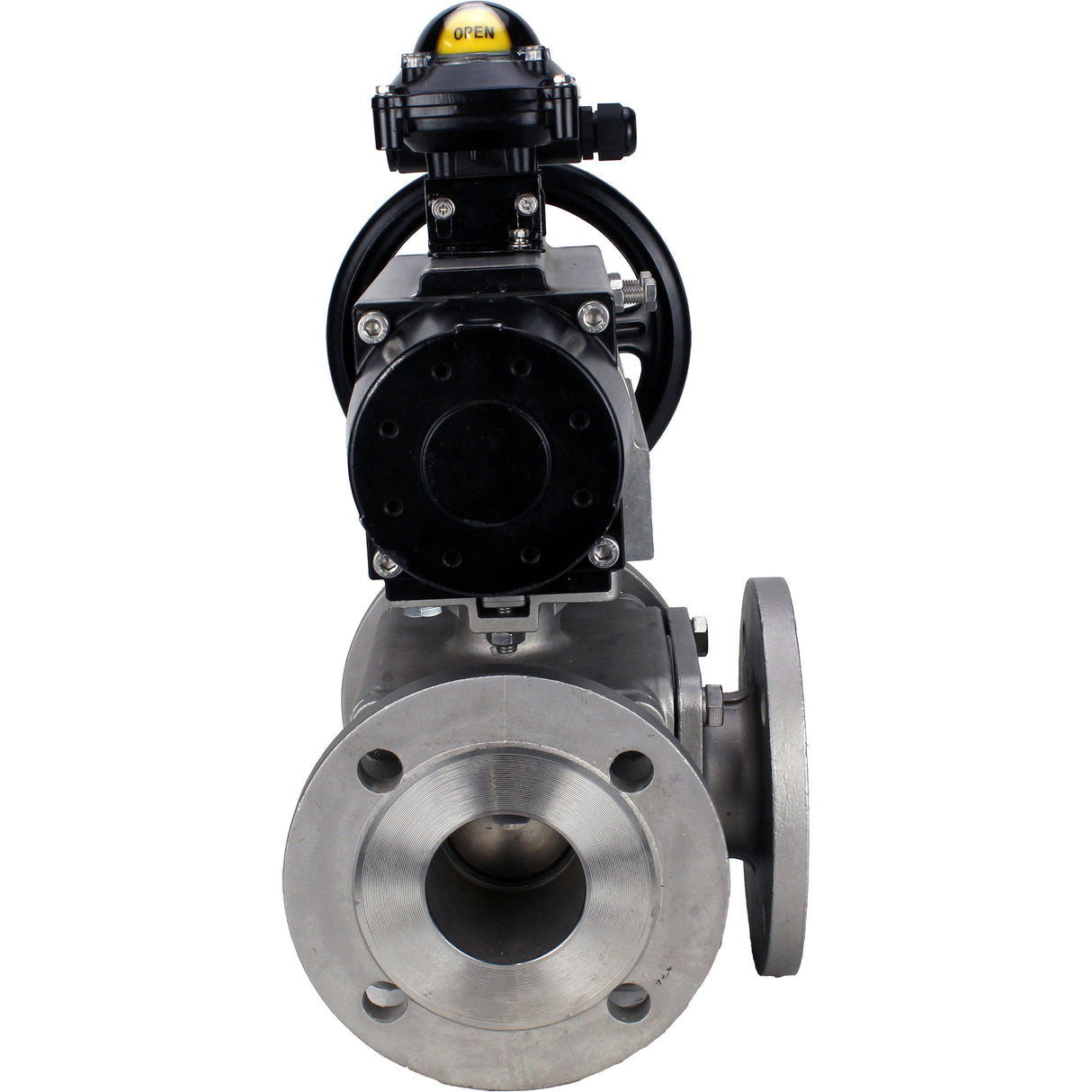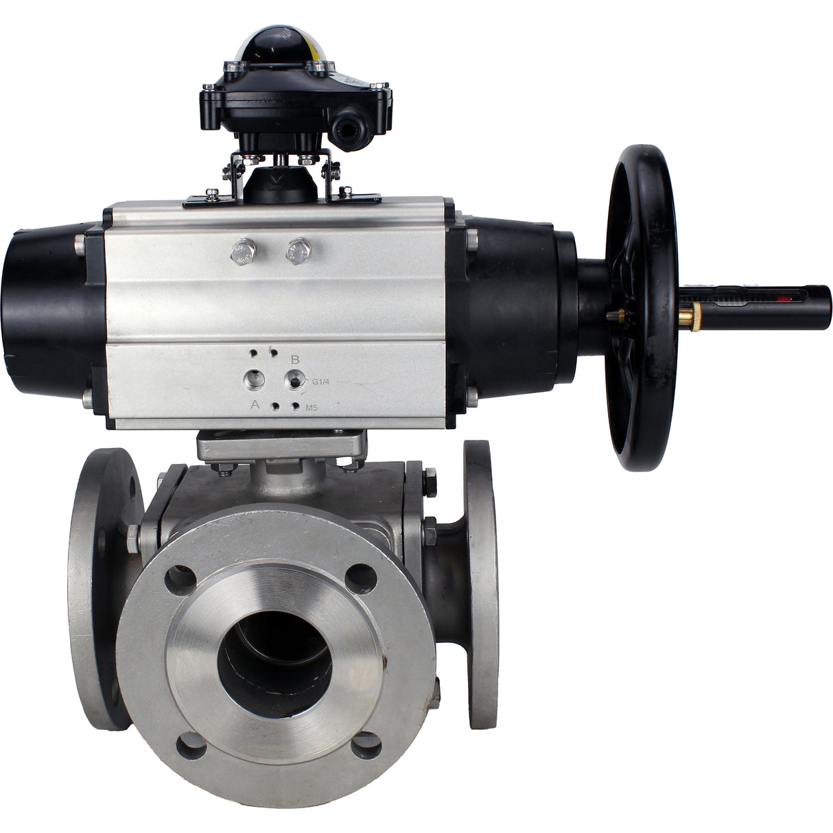 Kugelhähne Elephant BV3232P(4 Stück)-FP-3WL-F-ISO-H DN100 16 bar Vollbohrung, geflanscht, Gehäuse - Edelstahl SS316, ISO-Flansch F10/F12, quadratisch 19x19, mit doppeltem pneumatischem Antrieb PA-DA-105-1 Aktionen und LSU APL-210N