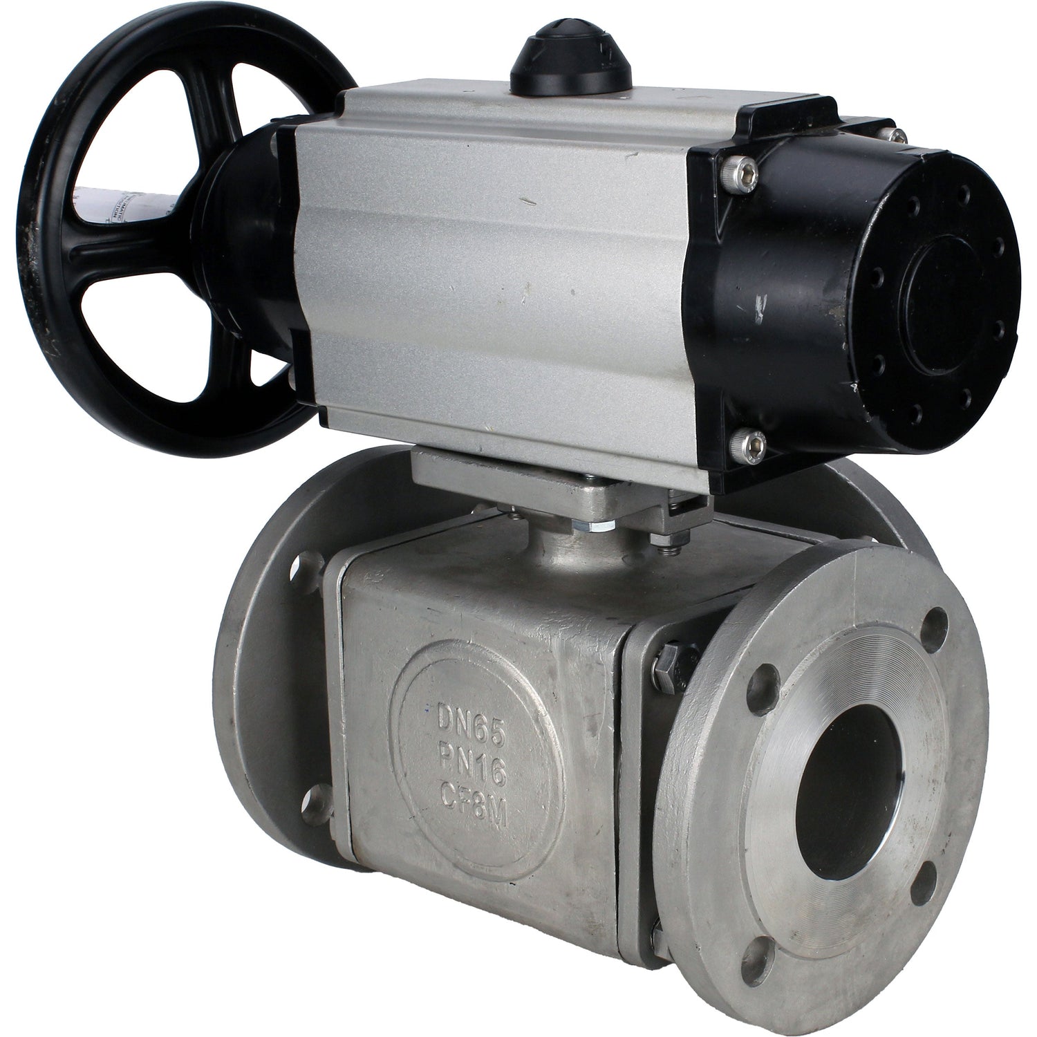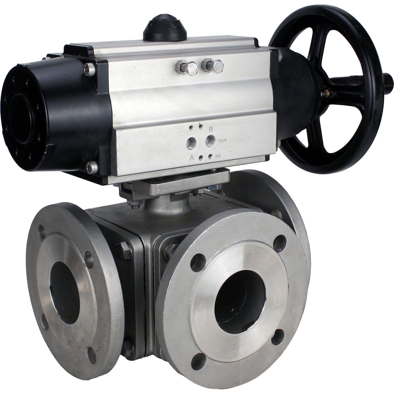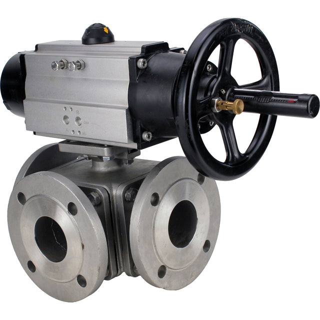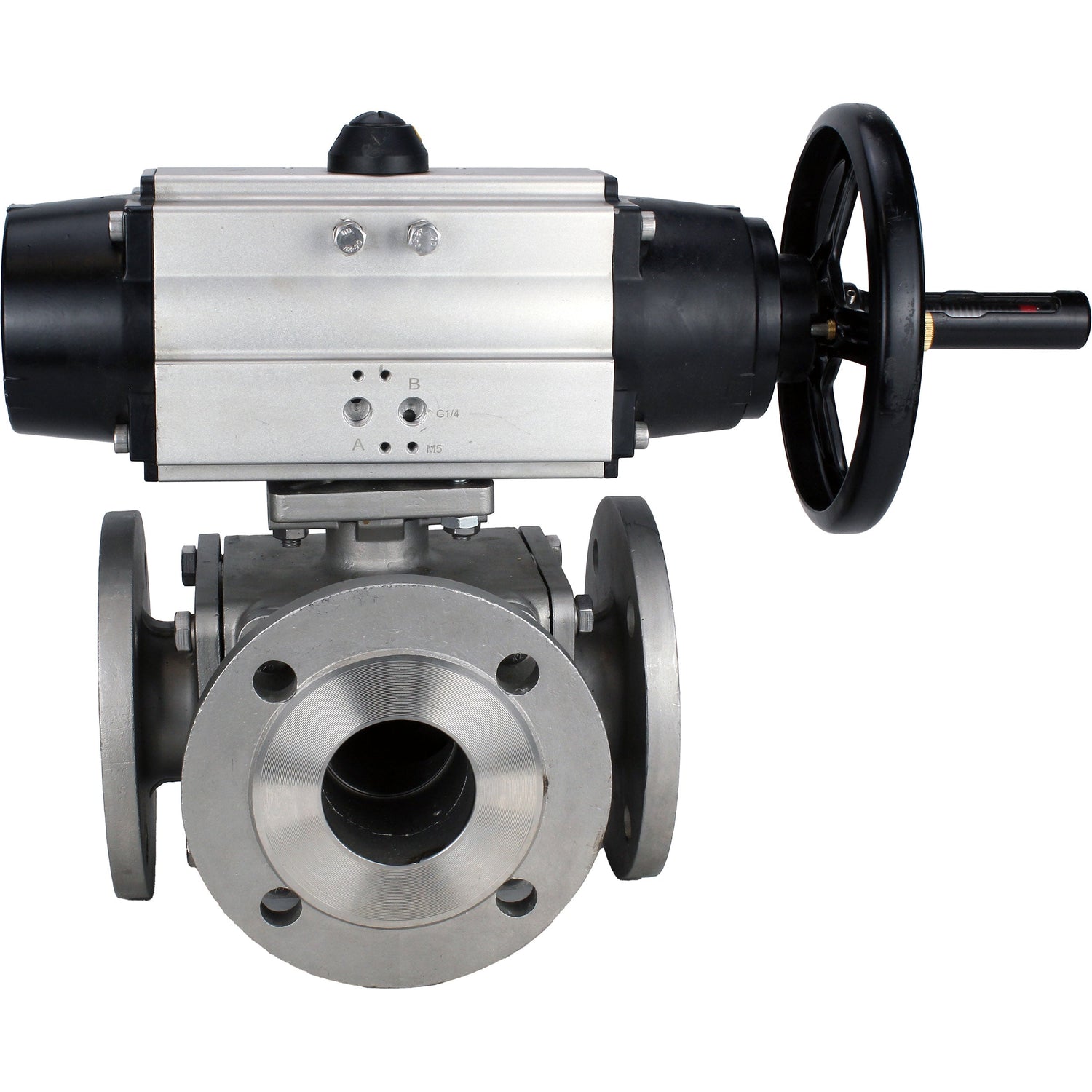 Kugelhähne Elephant BV3232P(4 Stück)-FP-3WL-F-ISO-H DN100 16 bar Vollbohrung, geflanscht, Gehäuse - Edelstahl SS316, ISO-Flansch F10/F12, quadratisch 19x19, mit doppeltem pneumatischem Antrieb PA-DA-105-1 Aktionen