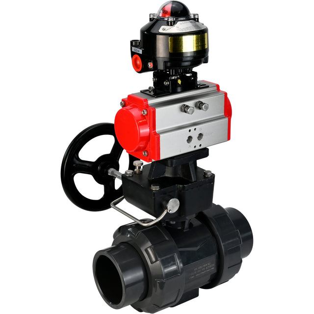 Ball valves Elephant BV4242E-FP-GRM-ISO, body material - UPVC, ball material - UPVC, seal - EPDM, with pneumatic actuator double action PA-DA, LSU APL-510N EX and handwheel MON