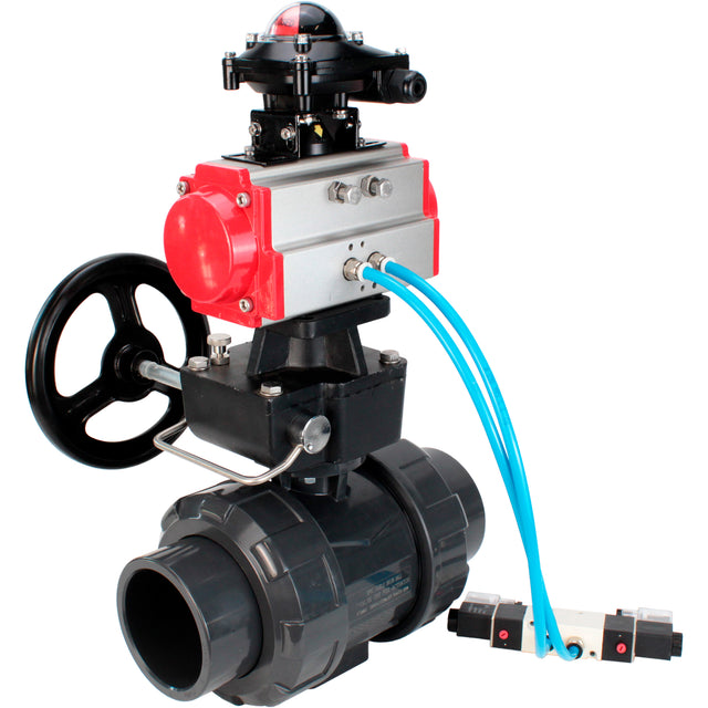 Ball valves Elephant BV4242E-FP-GRM-ISO, body material - UPVC, ball material - UPVC, seal - EPDM, with pneumatic actuator double action PA-DA, pneumatic distributor 4V320-08 220V, LSU APL-210N EX and handwheel MON
