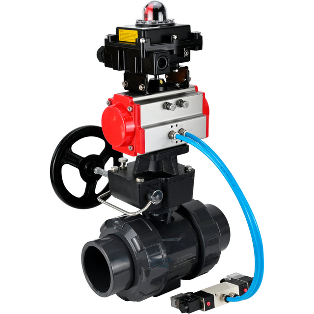 Ball valves Elephant BV4242E-FP-GRM-ISO, body material - UPVC, ball material - UPVC, seal - EPDM, with pneumatic actuator double action PA-DA, pneumatic distributor 4V320-08 220V, LSU APL-410N EX and handwheel MON