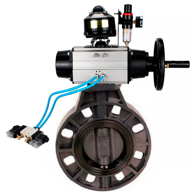 Butterfly valves Elephant WBV4242E-2W-Fb-ISO, body material - UPVC, disc material - UPVC, seal - EPDM, with pneumatic actuator double action PA-DA-105-1, pneumatic distributor 4V320-08 220V, LSU APL-210N and ATU AFC2000