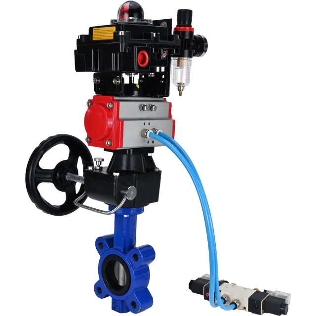 Absperrklappen WBV1631N-2W-Fb-H, Gehäusematerial - Gusseisen QT450, Scheibenmaterial - Edelstahl AISI 304, Dichtung - NBR, pneumatischer Antrieb PA-DA Doppelwirkung, 4V320-10 220V, LSU APL-410N EX, Handrad MON, ATU AFC2000